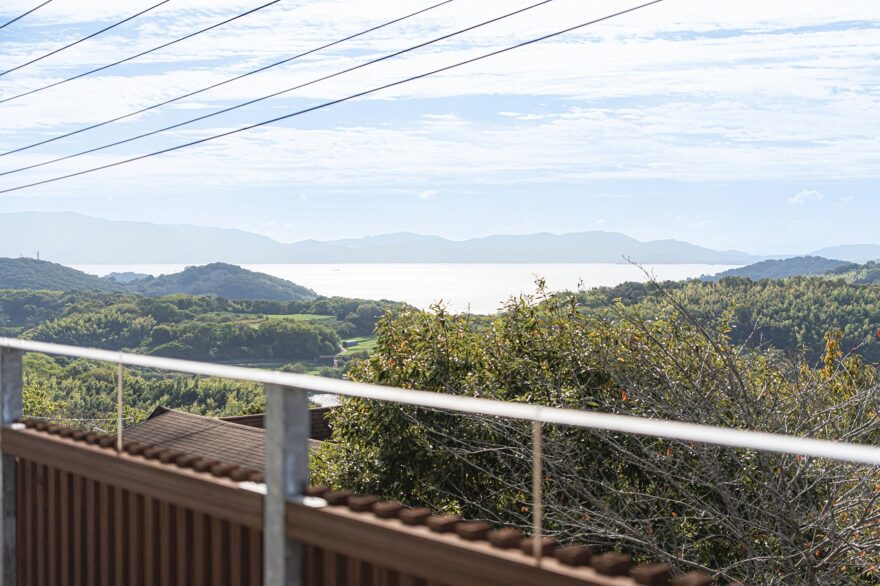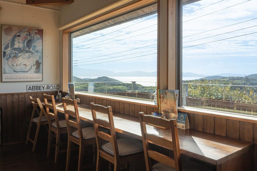 大きな窓から切り取られた景色には、山並みの向こうに瀬戸内海がきらめき、まるで1枚の絵画のよう🌊✨
