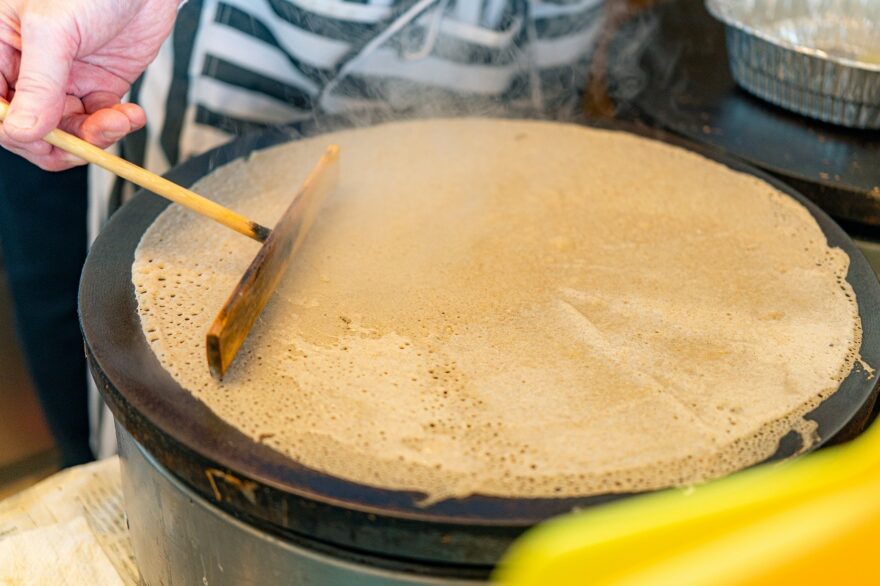 そば粉は、その先生も使うガレットのために開発された特製粉を使用。水と塩だけで作るそば粉100%の生地を、オーダーごとに丁寧に焼き上げます。