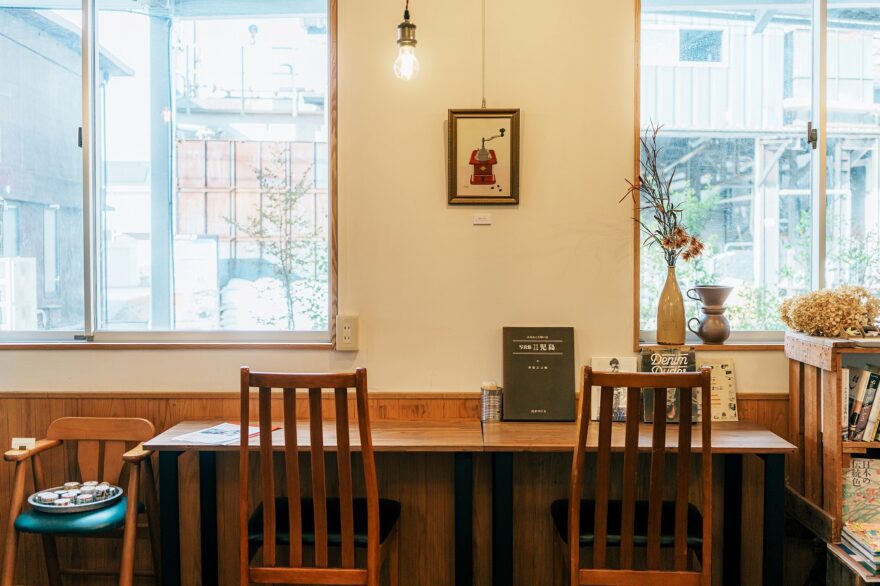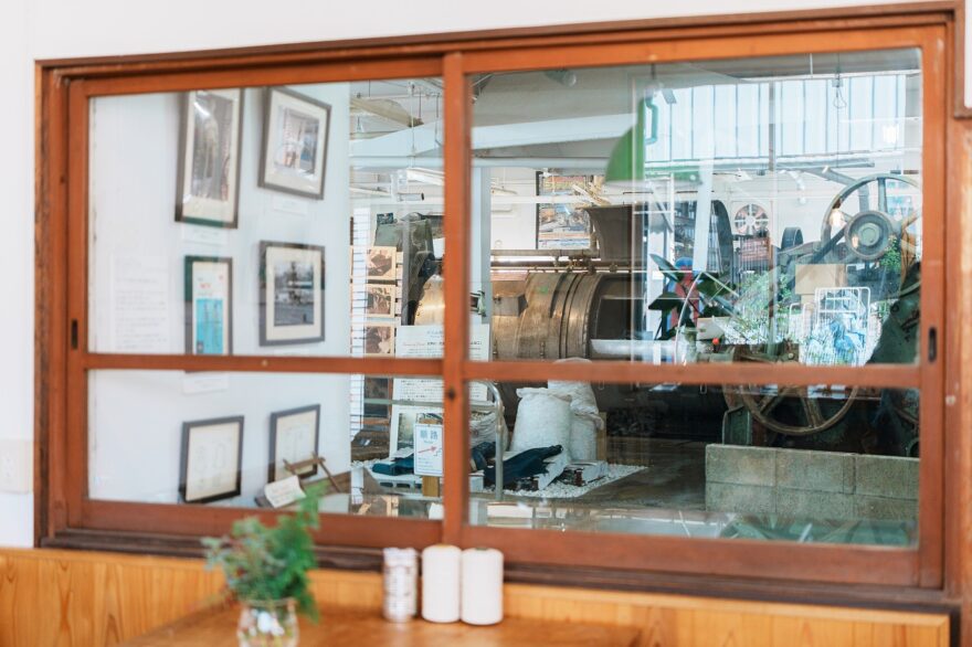 窓際のカウンター席からは、生地の加工や縫製、洗い、仕上げなどを分業体制で行う児島ならではのジーンズの文化を街の空気ごと感じることができます✨