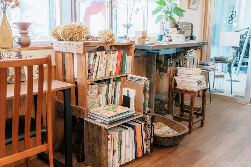 店内にはアメリカンなジーンズの街によく似合う家具でコーディネートされ、ヴィンテージミシンやジーンズを軸にした書籍やギャラリー、アートが並びます📚