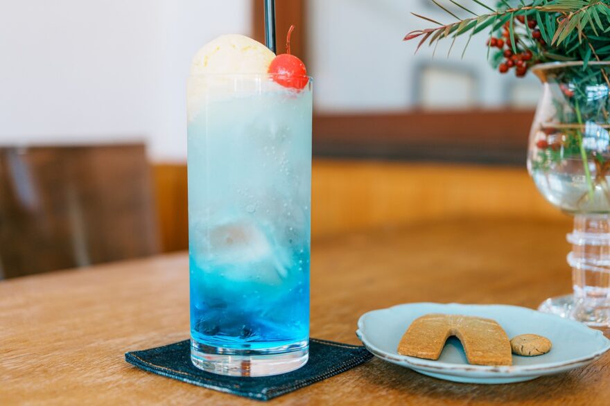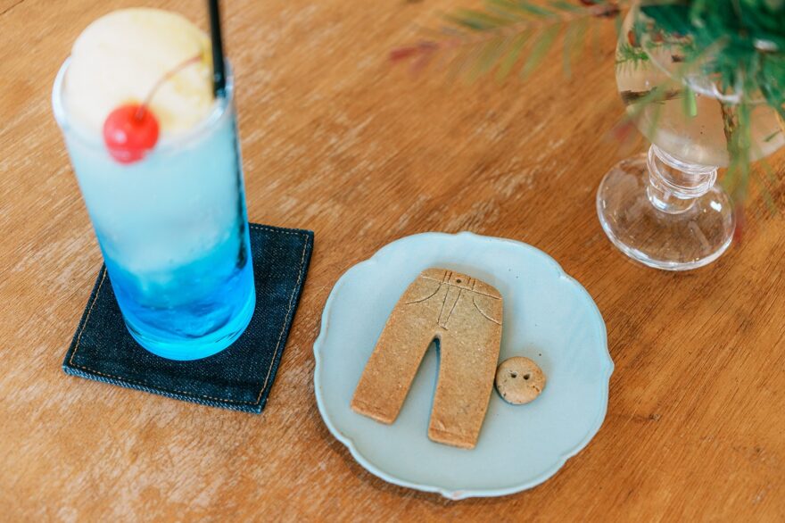 ジーンズのシルエットをした米粉のクッキーは、天然素材のバタフライピーで着色🍪クリームソーダの爽やかな青色も思わず写真に収めたくなる一杯です。