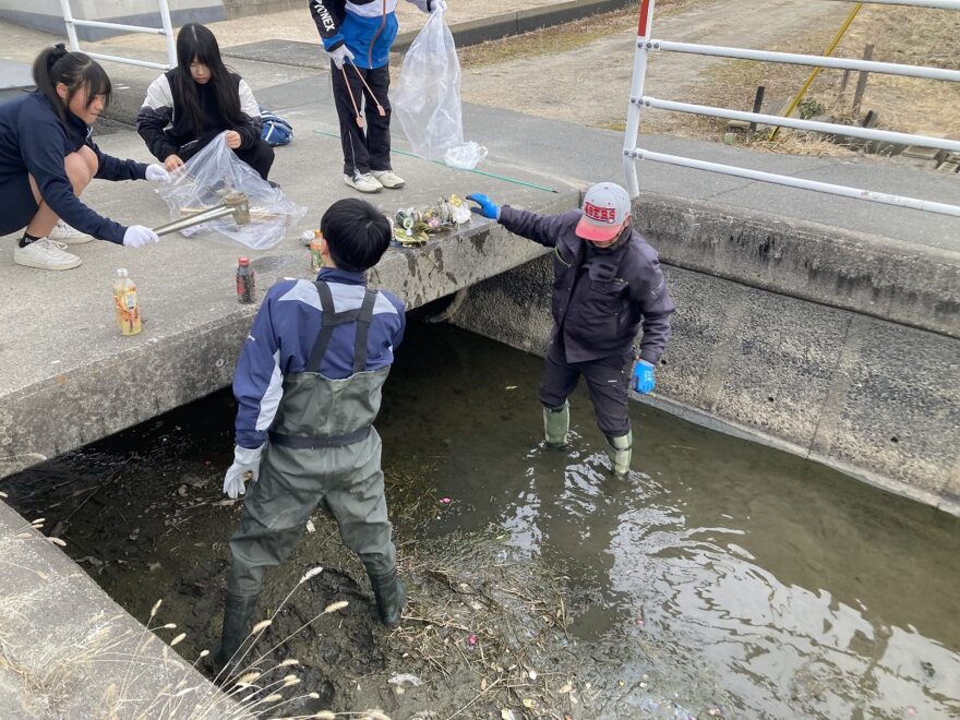 操南中学校では、こういった用水路から海へと流れつくごみを防ぐために、数年前から定期的に用水路の清掃を行っています。