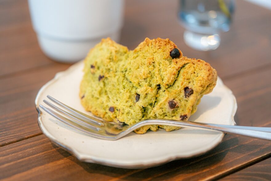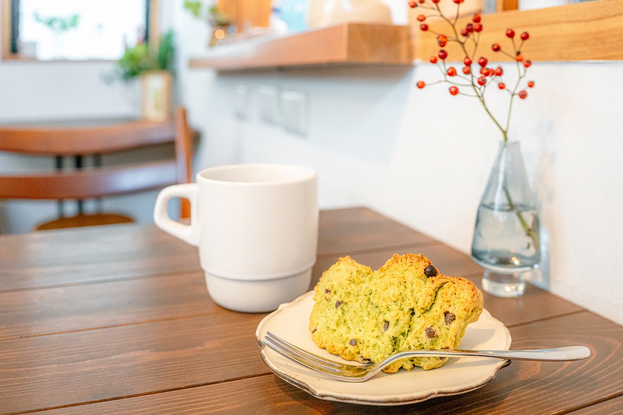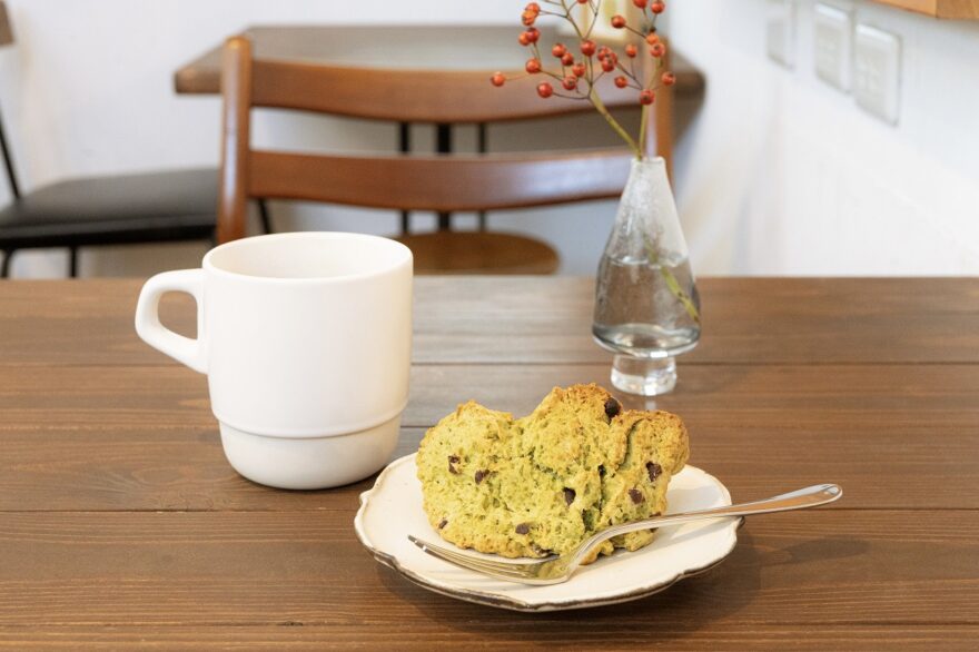 自家製の「よもぎチョコスコーン」は、真庭の『富原製茶組合』のよもぎ茶を使い、優しい香りとしっとりした生地です。