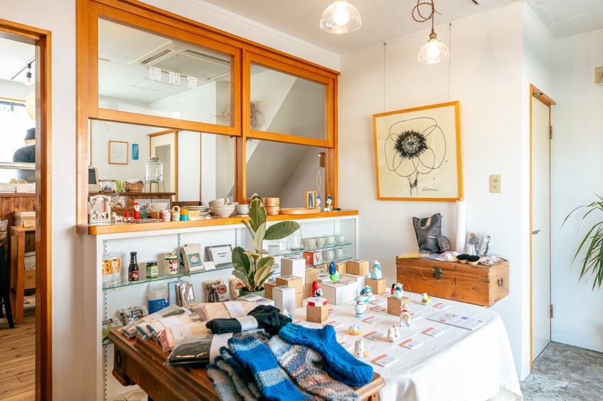 児島・琴浦地区で、東京から移住してきた稲葉さん夫妻が営む小さなカフェと雑貨の店。旧薬局だった建物をリノベーションした店内には、「暮らしを愉しむ」をコンセプトに集められた雑貨や食品が並びます。