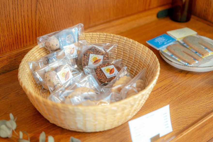 食品もそろい、オーガニック素材を使用した『Eko.9』、ヴィーガン&グルテンフリーの『サンカカオ』の焼き菓子はファンが多いそう🍪 また、岡山中央水産有限会社の乾物は地元の人が日常使いで買いに訪れる定番品💡