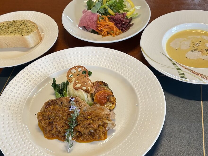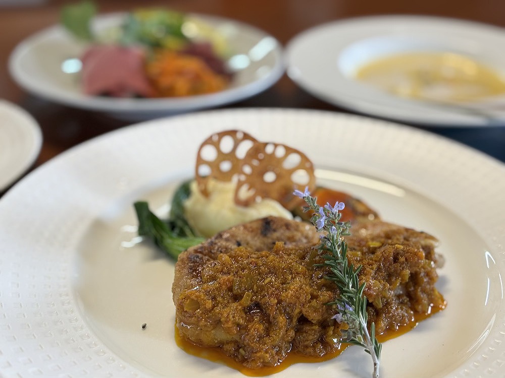 付け添えにはもちろん、野菜のクリームスープ、サラダなどにも、道の駅やファーマーズマーケットなどで仕入れたフレッシュな地元野菜がたっぷり使われているのもポイント高め✌