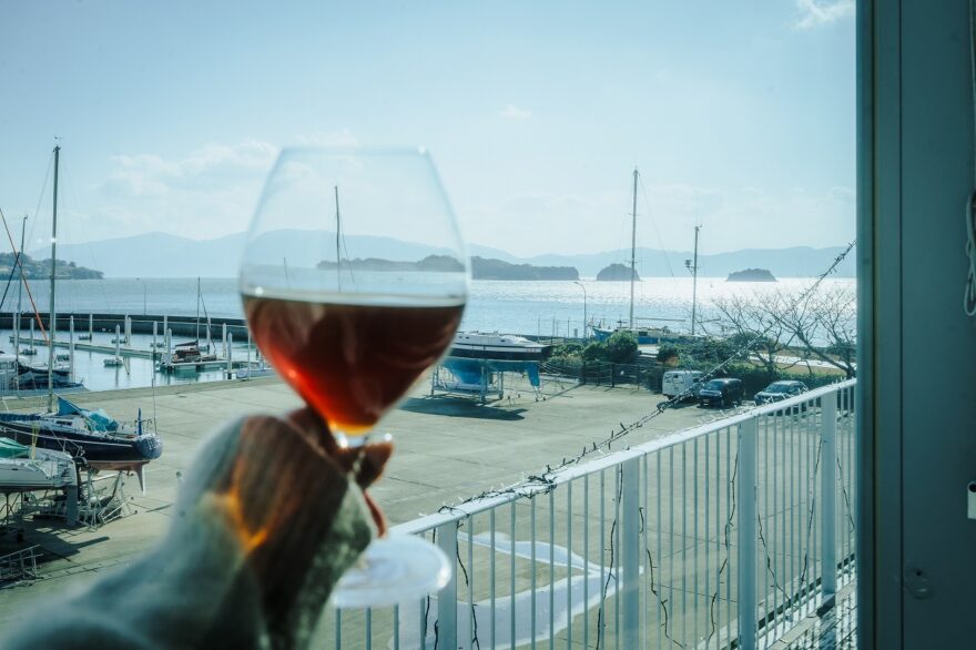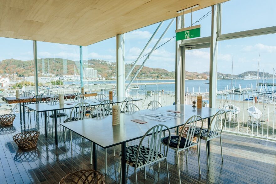 場所は『牛窓ヨットハーバー』のクラブハウス内2階。大きなガラス張りの店内からはヨットが整然と並ぶハーバーと、その先に広がる瀬戸内海の島々を一望できます✨